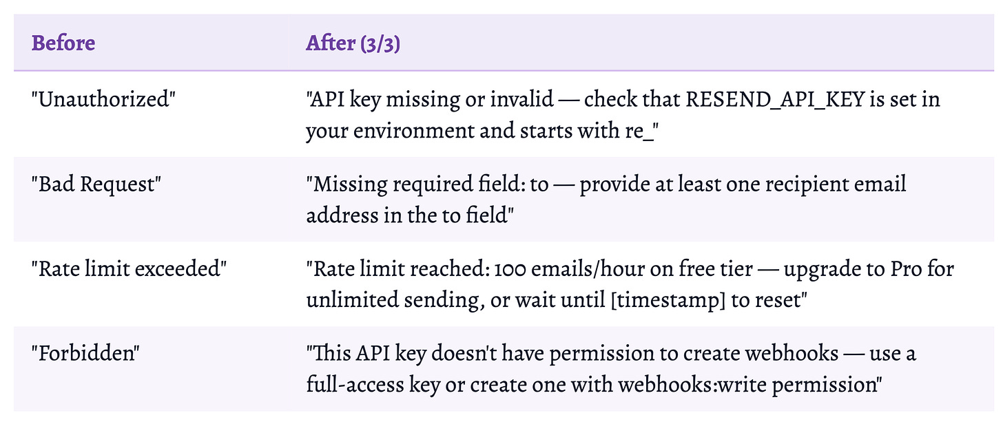 Error messages are the most underestimated growth lever in developer infrastructure. When an agent hits a 4xx and can’t recover, it doesn’t retry; it routes around you. That routing decision is often permanent.